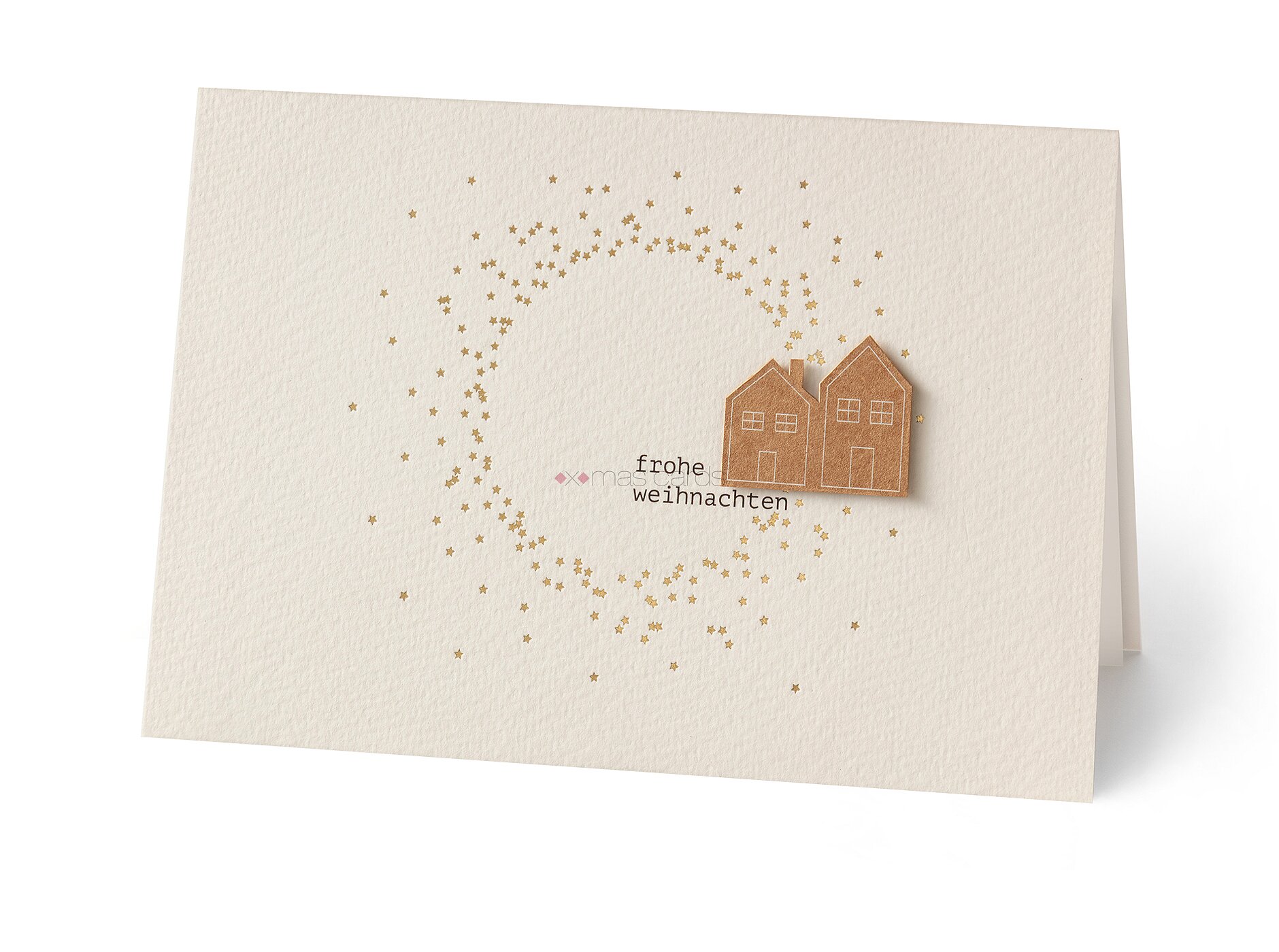 Diese wunderschöne Weihnachtskarte ist mit funkelnden goldenen Sternen verziert, die den Himmel über einer winterlichen Szenerie zum Leuchten bringen. Auf der Karte sind liebevoll aufgeklebte kleine Häuschen zu sehen. Die Kombination aus den glänzenden Sternen und den charmanten Häuschen vermittelt Wärme, Geborgenheit und den Zauber der Weihnachtszeit.